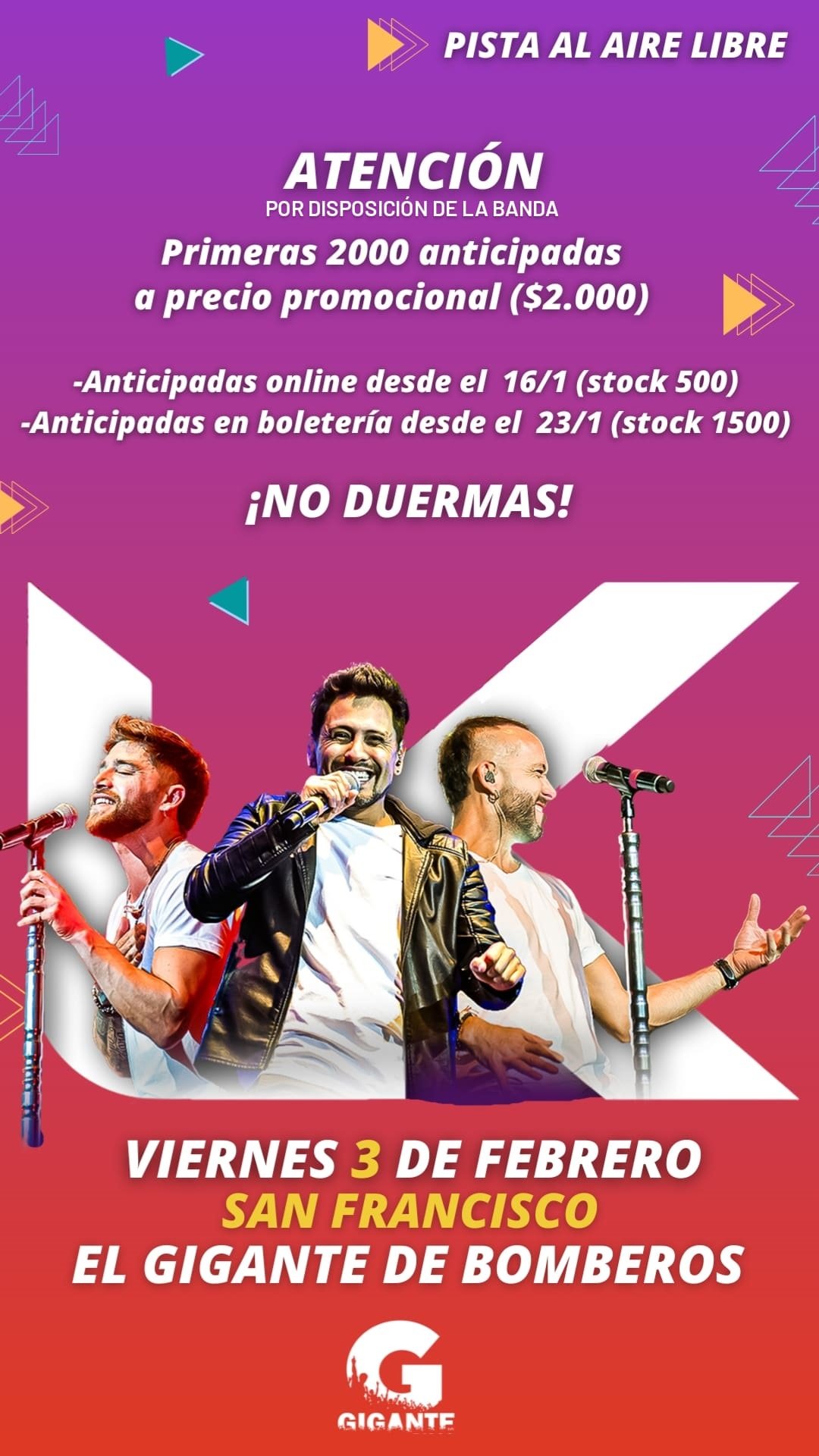 Por disposición de la banda conformada por Pablo Tamagnini, Nelson Aguirre y Diego Granadé, las primeras 2000 anticipadas se venderán a un costo promocional de $2.000.