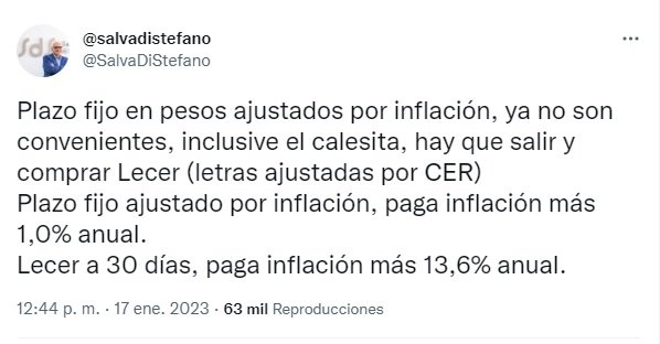 “Hay que salir y comprar Lecer (letras ajustadas por CER)”, sentenció Di Stefano, tras lo cual explicó el motivo: “Plazo fijo ajustado por inflación, paga inflación más 1,0% anual. Lecer a 30 días, paga inflación más 13,6% anual”, argumentó.