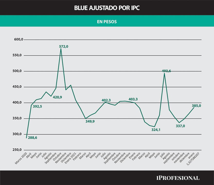 En tal caso, la serie corregida muestra una situación totalmente diferente, pues lejos de ser un récord histórico, el precio actual del blue es muy inferior al registrado en algunos momentos puntuales como fueron octubre de 2020 y precisamente, julio del año pasado.