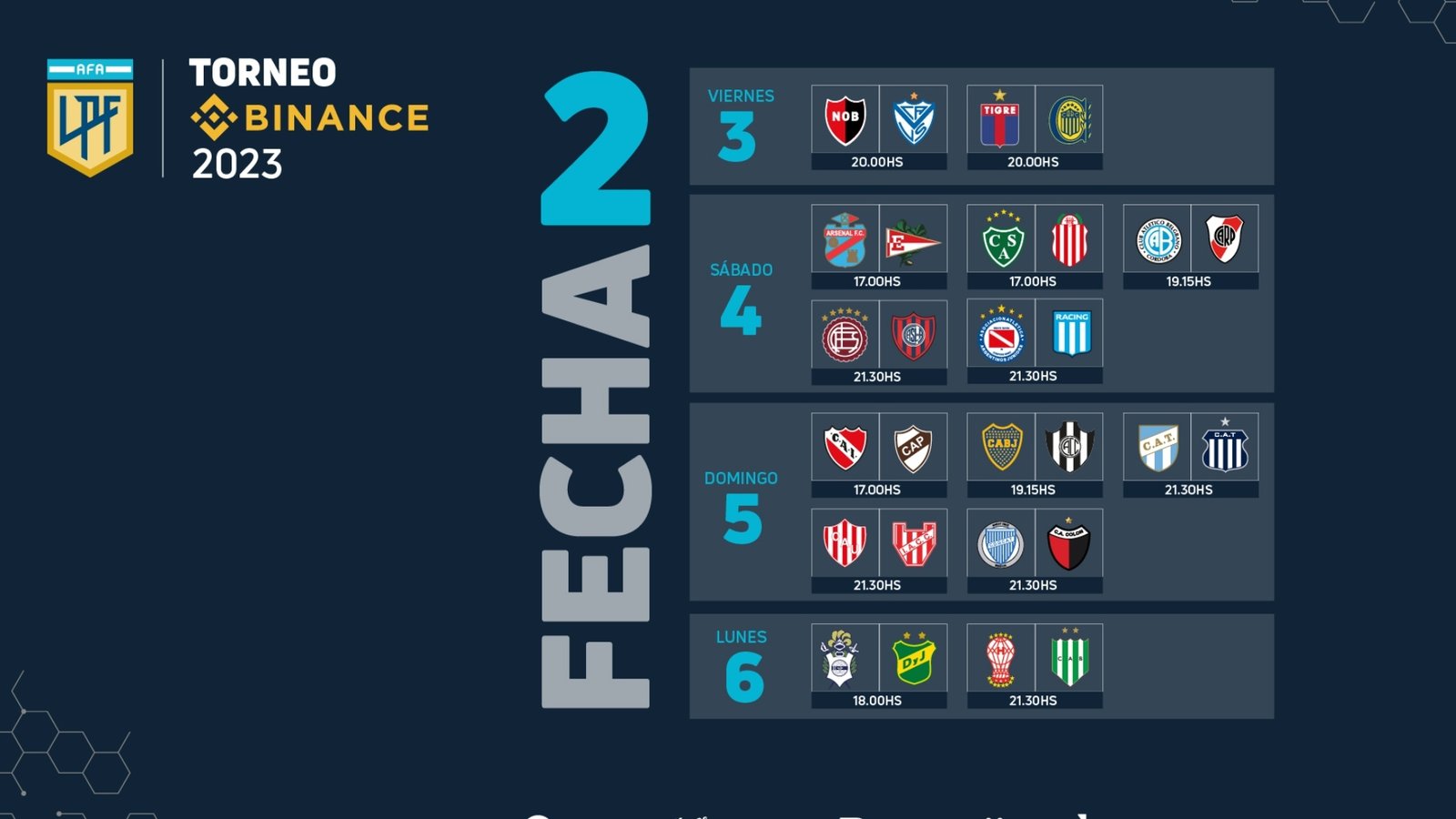 Este viernes se pone en marcha la segunda fecha de la Liga Profesional 2023, con el duelo que protagonizarán en Rosario, Newell’s y Vélez. La fecha finalizará el lunes con el partido entre Huracán y Banfield, y en el medio tendrá a Boca recibiendo a Central Córdoba, a River visitando a Belgrano, Racing lo propio a Argentinos e Independiente siendo local contra