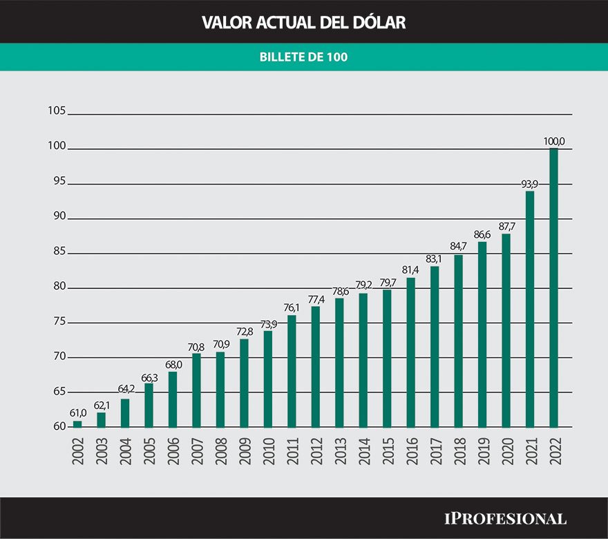 Del mismo surge que por el efecto inflacionario, quien compró 100 dólares en el año 2002, por dicha circunstancia su valor actual se habrá reducido a poco más de 61 dólares, por lo que la pérdida de poder adquisitivo en estos 20 años se contrajo nada menos que un 40 por ciento.