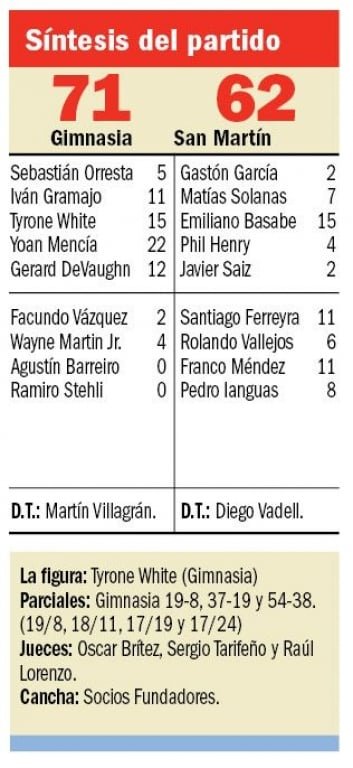 Gimnasia no se cayó en ningún momento de su enorme producción, porque así redujo a su rival y además Yoan Mencía comenzó a enderezar la mira cerca de la canasta para irse +20. Así fue hasta el final del primer tiempo. El local dominando y San Martín, con algunas ausencias importantes, lejos de su nivel y reaccionado mínimamente antes del descanso largo.