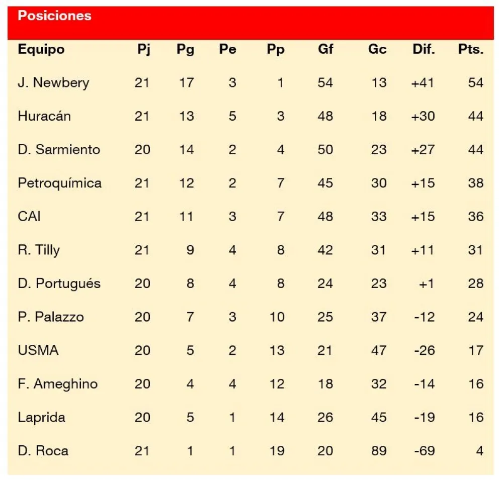 Huracán igualó en uno con CAI en cancha de Palazzo y se sostiene como uno de los perseguidores del campeón Jorge Newbery, mientras que Deportivo Roca, en 21 presentaciones, es la segunda vez que suma, al empatar de local dos a dos frente a Petroquímica. La fecha se inició el sábado con la victoria del Aeronauta sobre Rada Tilly por dos a uno y continuará mañana donde Sarmiento, recibiendo a Palazzo, tendrá la oportunidad de consolidarse como único escolta.