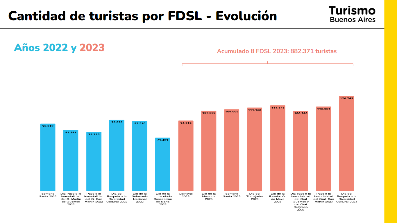 “Durante este año, los fines de semana largos nos han dado el ejercicio necesario para renovar la oferta turística de la Ciudad. Eso nos permitió experimentar un crecimiento escalonado en el número de turistas, alcanzando un total de más de 880.000 visitantes en el acumulado de los 8 fines de semana largos de 2023.Esa es una clara muestra de que la Ciudad de Buenos Aires está más presente que nunca entre los destinos preferidos de los viajeros», destacó Lucas Delfino, presidente del Ente de Turismo de la Ciudad de Buenos Aires.