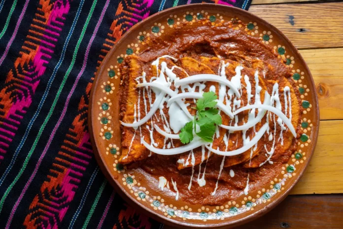 - Enchiladas potosinas: clásicas de San Luis Potosí,tortillas hechas con chile y bañadas con queso y crema.