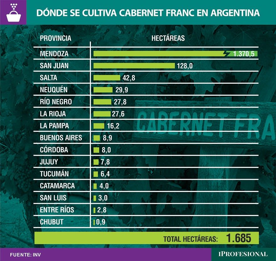 Aunque esta cifra sigue siendo limitada en comparación con la extensión total de viñedos, el mapa vitivinícola muestra que existe una gran diversidad, dado que actualmente hay Cabernet Franc plantado en 15 provincias. Lidera Mendoza, con el 81% del total, seguido por San Juan y Salta. Pero también puede encontrarse en terroirs muy diversos, como Buenos Aires, La Pampa, Córdoba, San Luis, Chubut y hasta Entre Ríos.