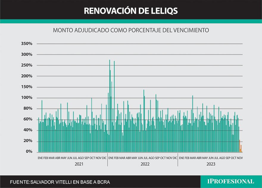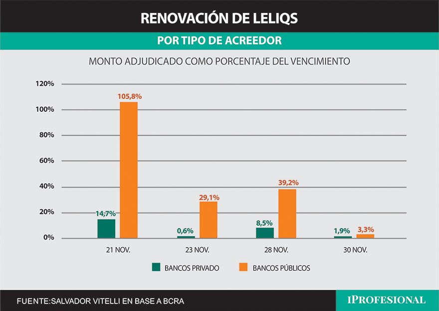 En la última semana de noviembre hubo dos licitaciones de Leliqs, con vencimientos por $3,6 billones, de los cuales $1,6 billones correspondían a bancos privados mientras que $2 billones, de bancos públicos. Se renovó solo $0,4 billones (un 11,4% de los vencimientos).