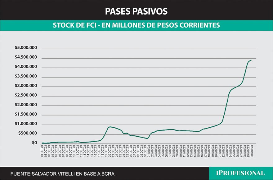 En detrimento de la no renovación de Leliqs, los Pases Pasivos comenzaron a mostrar un fuerte incremento en su stock y el monto adjudicado tanto por bancos privados, públicos y fondos comunes de inversión. El stock actual asciende a $14,7 billones ($4,4 de bancos públicos, $5,9 de bancos privados y $4,4 de FCI), frente a $7,5 billones que representan actualmente las Leliqs. Al principio de noviembre el stock era de: Pases por $8,7 billones y Leliqs por $13,5 billones. Es decir, la participación de los instrumentos a un día aumentó de manera notoria.