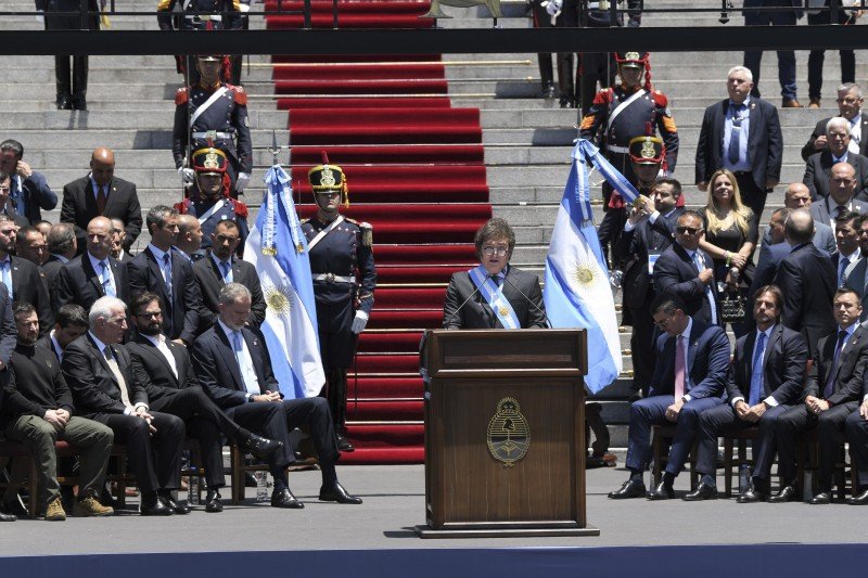 “Ningún gobierno ha recibido una herencia peor, el kirchnerismo nos deja déficit gemelos de 17 puntos del PBI, los salarios están destruidos y giran en torno a los 300 dólares, nos han arruinado la vida”, afirmó Milei, que habló en la explanada del Congreso, frente a la gente que lo escuchaba en la plaza, del otro lado de la avenida Rivadavia.