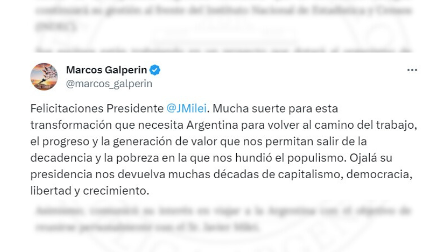 En tanto, Marcos Galperin, creador y dueño de Mercado Libre, opinó sobre la nueva gestión a través de su cuenta en la red social “X”, en la cual le deseó al Presidente “mucha suerte para esta transformación que necesita Argentina para volver al camino del trabajo, el progreso y la generación de valor que nos permitan salir de la decadencia y la pobreza en la que nos hundió el populismo. Ojalá su presidencia nos devuelva muchas décadas de capitalismo, democracia, libertad y crecimiento”.