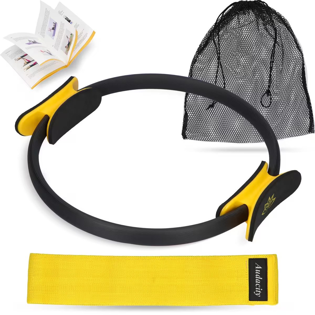Aunque podemos realizar yoga o Pilates únicamente con nuestro cuerpo y una  esterilla, sumar elementos como un aro de Pilates y una banda de resistencia siempre eleva la intensidad de nuestros entrenamientos. En Decathlon puedes obtener ambos elementos juntos por menos de 40 euros.