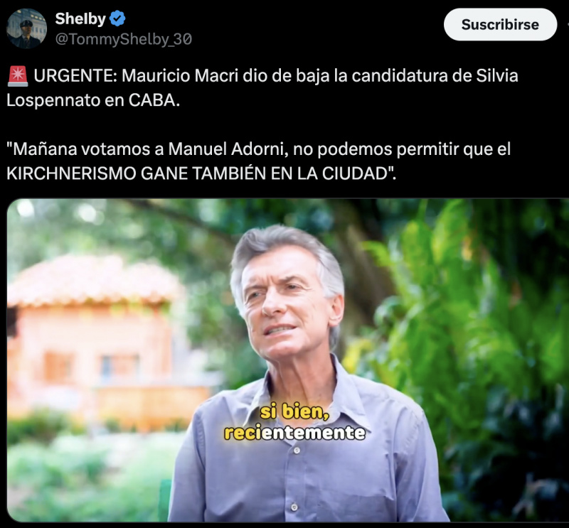 “A horas de la elección, un burdo video generado con inteligencia artificial fue publicado en X. En él, se muestra una recreación verosímil de mi persona haciendo declaraciones que nunca hice sobre nuestra lista”, denunció Macri y agregó “más allá de la efectividad que pueda tener, esta acción tramposa demuestra un profundo desprecio por las reglas electorales y, en el fondo, por la democracia misma. El PRO tomará las acciones legales que considere convenientes. Mientras tanto, Silvia Lospennato se prepara para defender mañana nuestra lista, que representa, entre otras cosas, el respeto a las reglas, a la verdad y a la democracia”.