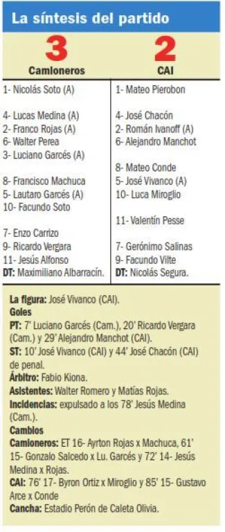 Aun así, la victoria recién llegó en el minuto final. Un penal sancionado a favor de CAI -muy protestado por los jugadores de Camioneros- le dio la gran oportunidad de quedarse con todo.